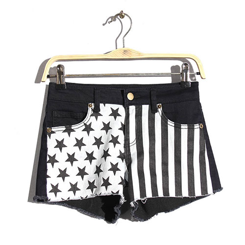 These shorts feature a low-slung waist,a frayed edge,stars and stripes print in the front,and button/zipper closure in the front.Wear them with cropped tops and keep your style on point.
