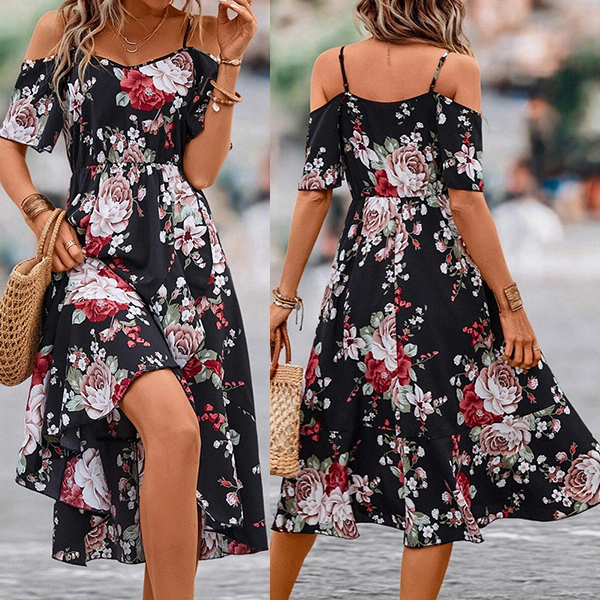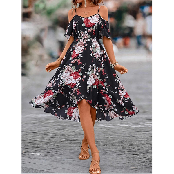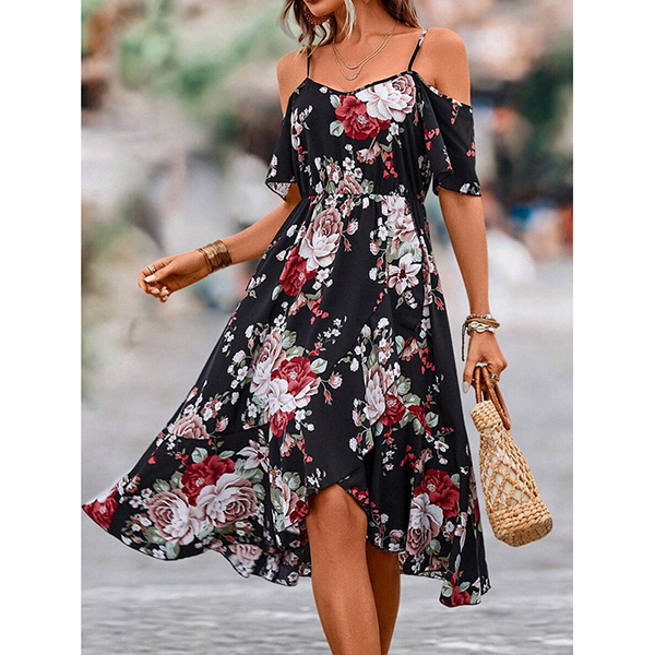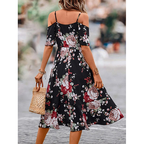 Fashion Floral Prined Open-shoulder High-rise Midi Dress