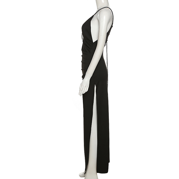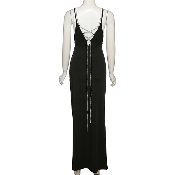 exy Solid Color Sleeveless Deep V-neck High Slit Chain Lace-up Backless Dress