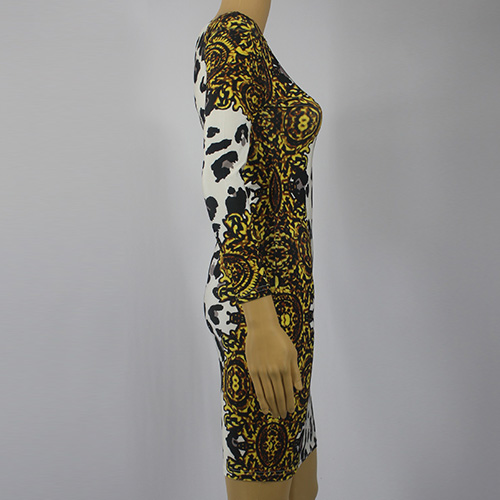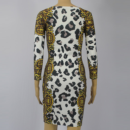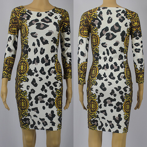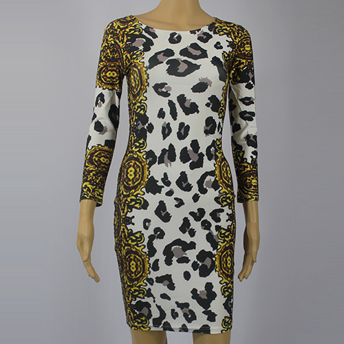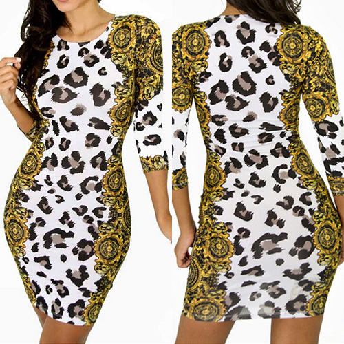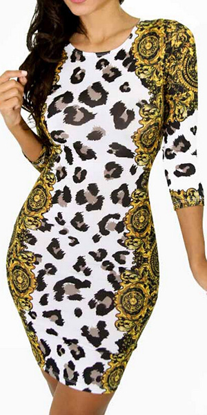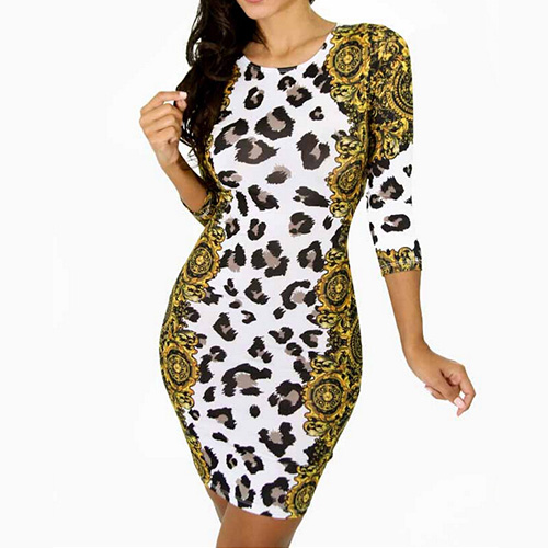 This sheath dress features leopard pattern,chic and eye-catching. Outfitted with 3/4 sleeve,round neck