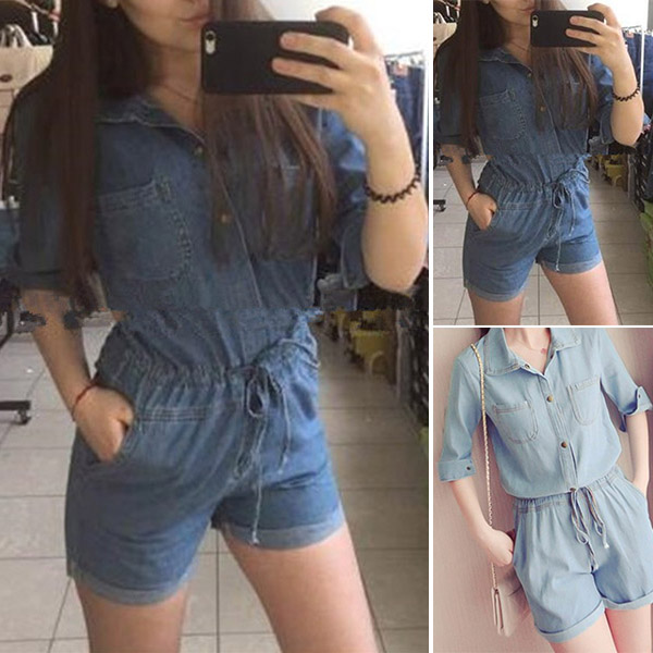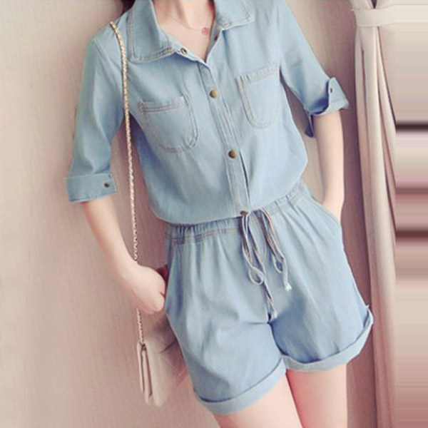 For moments when you're short of time for wardrobe mix and match, settle for easy-to-wear romper such as this creation. This denim romper is designed with 3/4 sleeve,POLO collar and a drawstring waistline design,which not only can showcase your slenderer figure,but also can exude your personality and style.