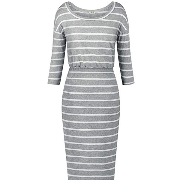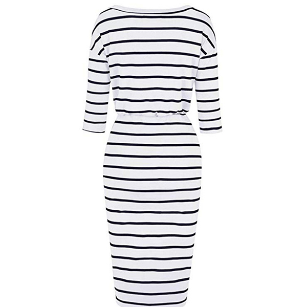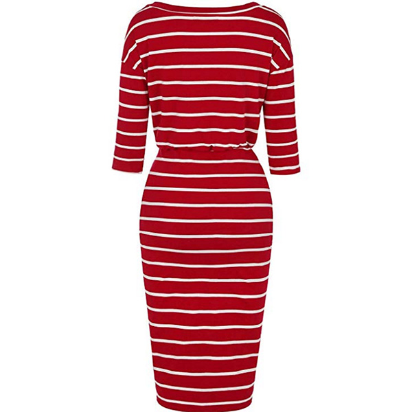 Fashion 3/4 Sleeve Round Neck High Waist Striped Dress
