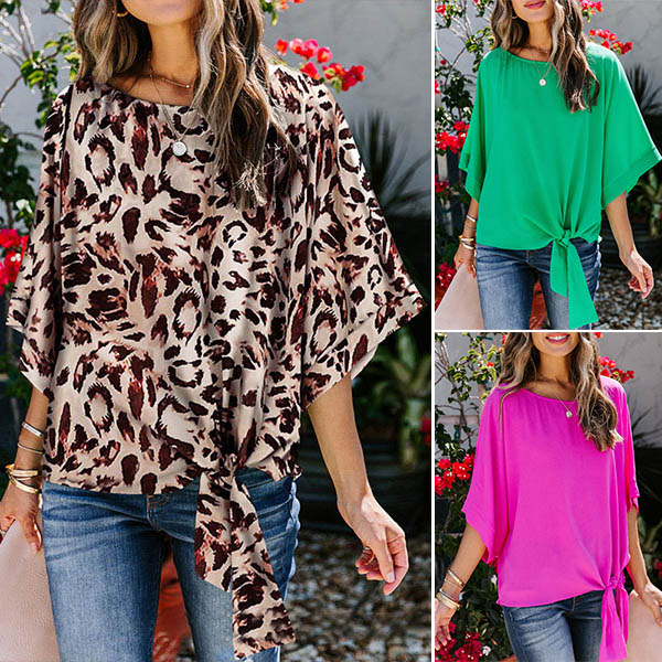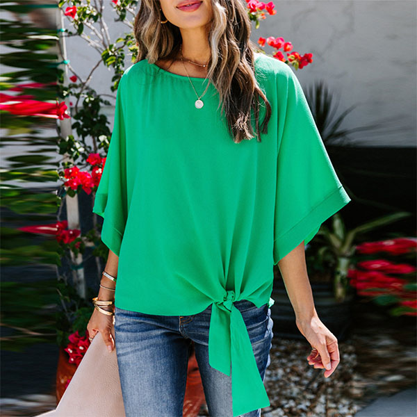 Fashion 3/4 Trumpet Sleeve Round neck Lace-up Hem Loose Top