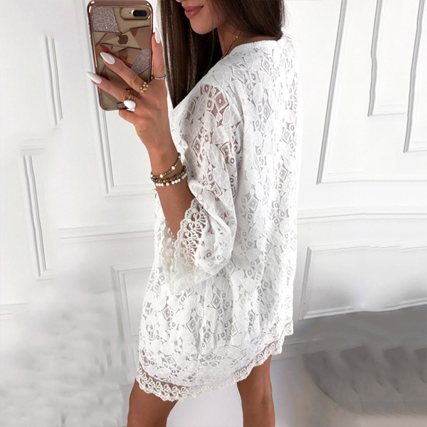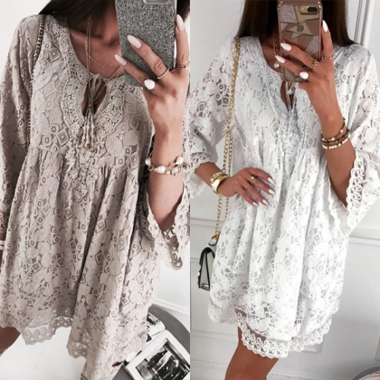 Fashion 3/4 Trumpet Sleeve V-neck Loose Lace Dress