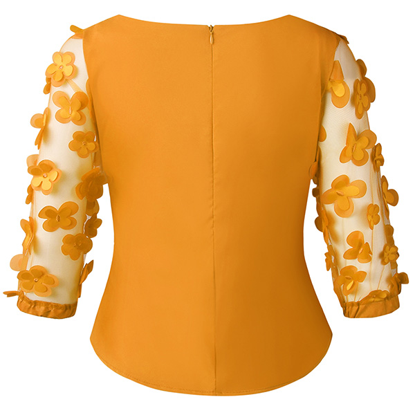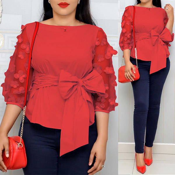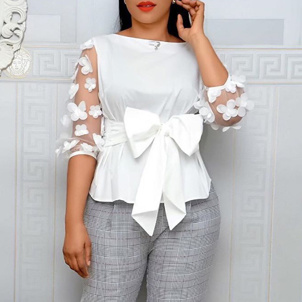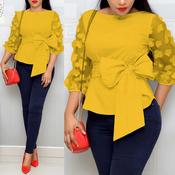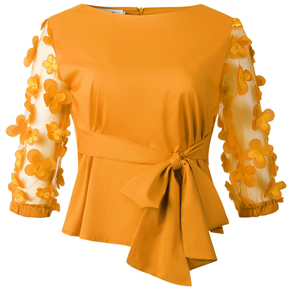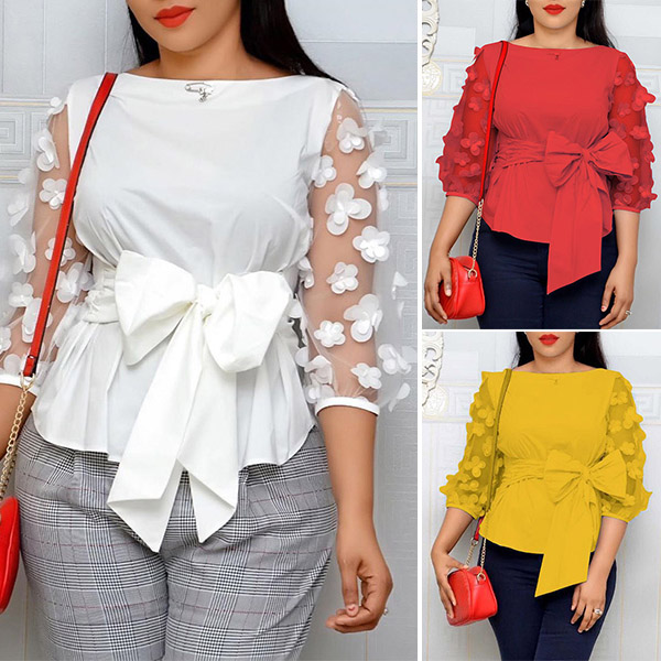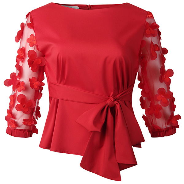 Only need one glance,you would fall in love with this wonderful top. The gauze spliced 3/4 sleeve and 3D flower details make this piece look so flirty and distinctive. Moreover,the lace-up bow-knot design at the waist part will further enhance its charm. So why not have a try it it update your style?