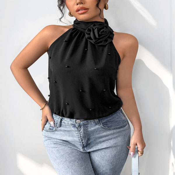 Fashion 3D Rose Beaded Mock Neck Sleeveless Bodysuit