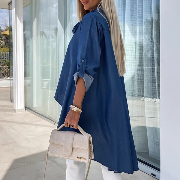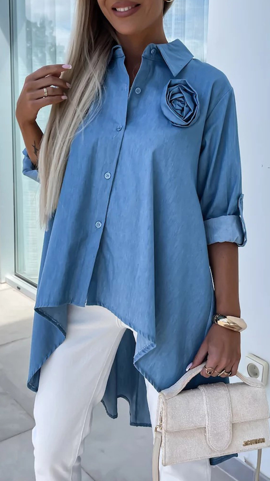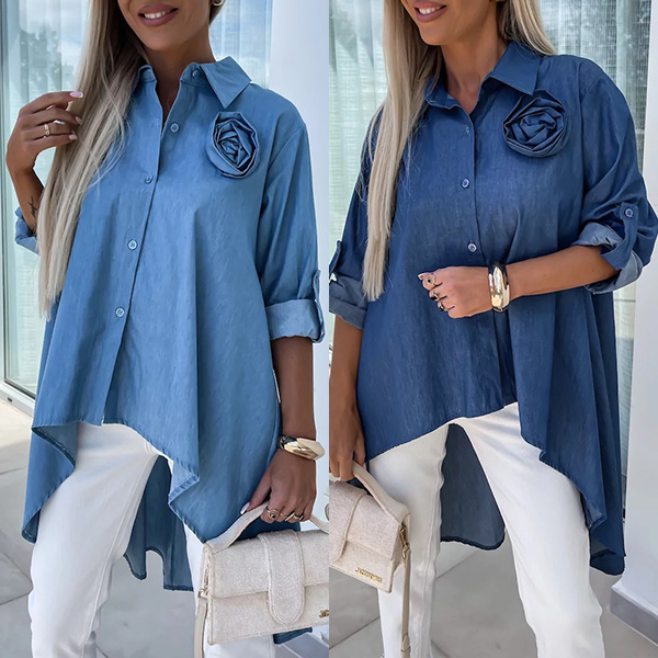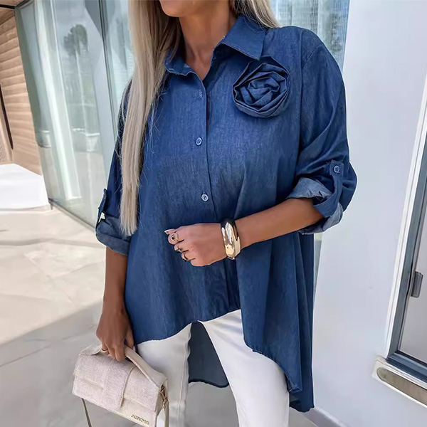 Fashion 3D Rose Collar Long Sleeve Irregular Hemline Denim Shirt