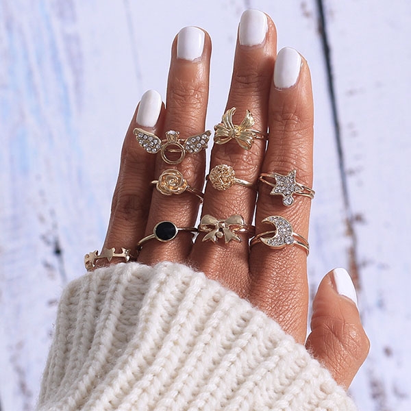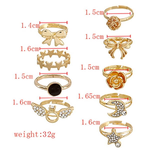 pieces different rings like bowknot shaped,star shaped,rose shaped and so on,this ring set of course knows