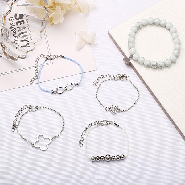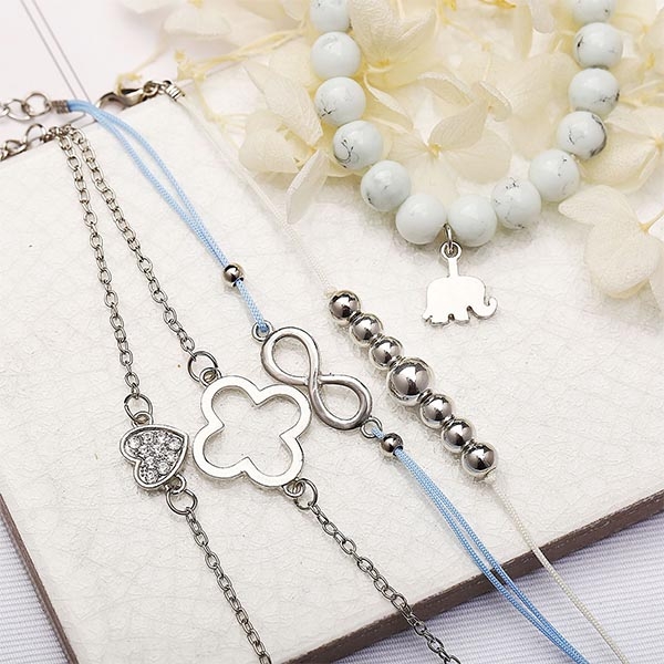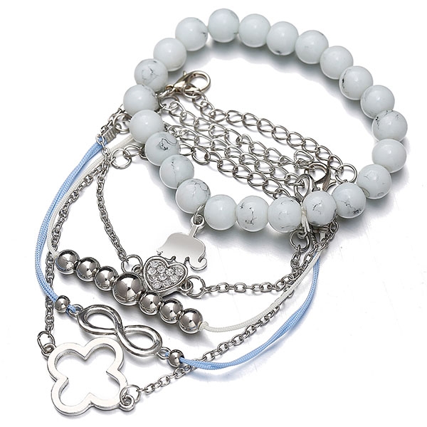 This bracelet set consists of 5 pieces different bracelets,decorated with heart,elephant and beaded details,