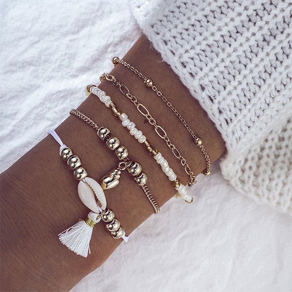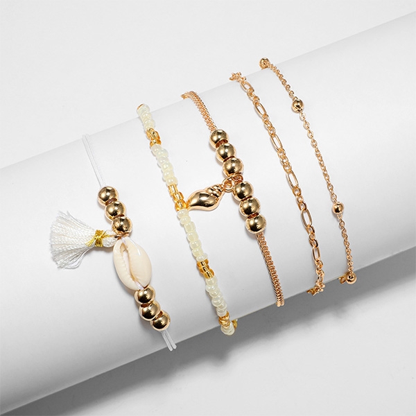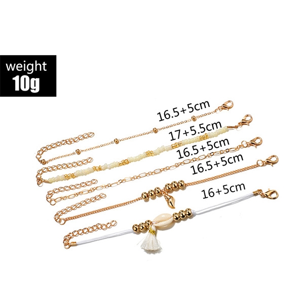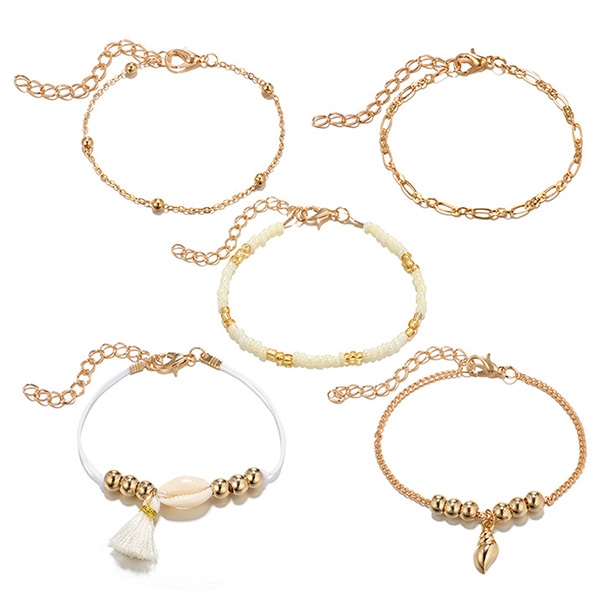 Consists of 5 pieces different bracelets,the shell,tassel and beaded design make it look so attractive.