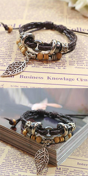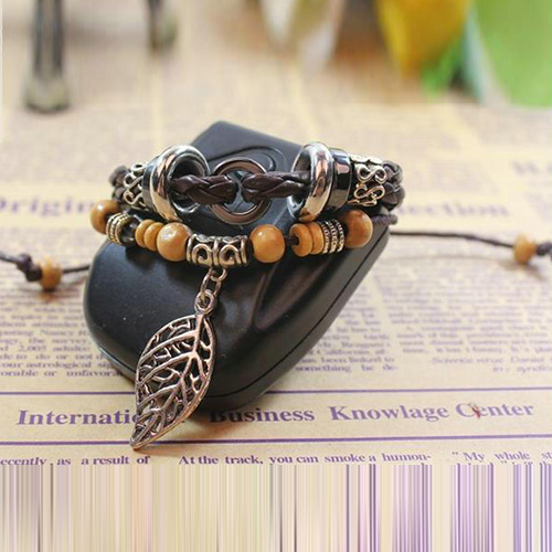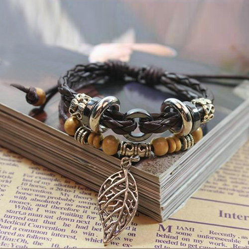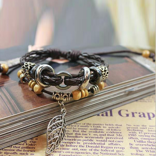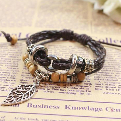 Punk style bracelet,with leaf pendant and hand-beaded for decoration,