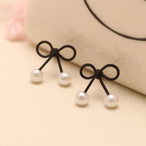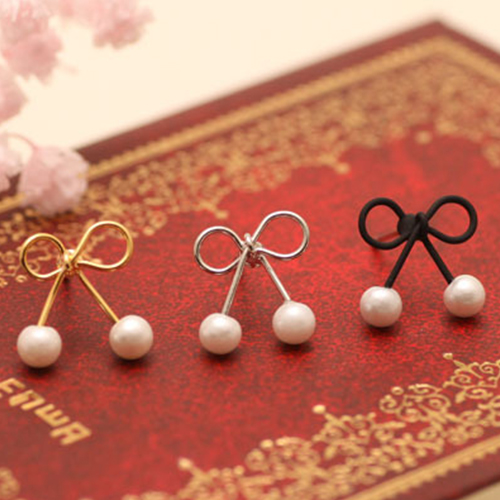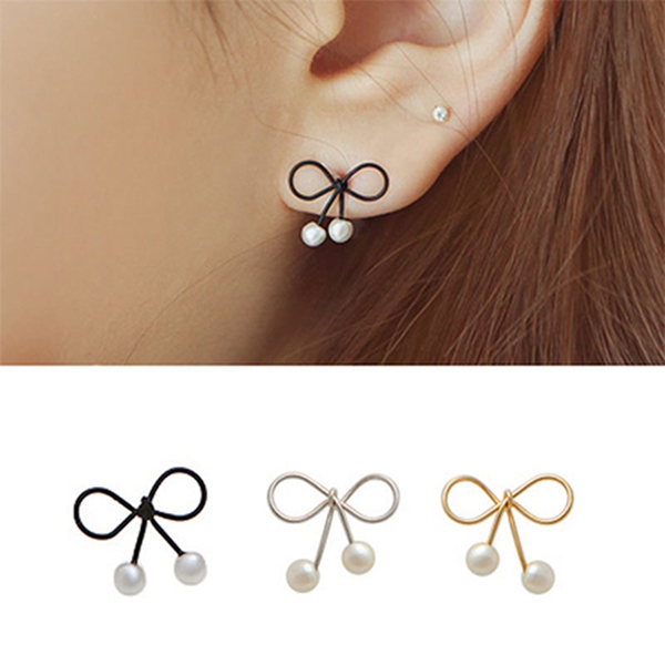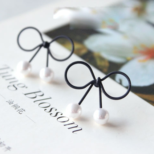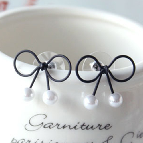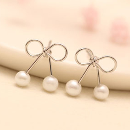 The stud earring is outfitted with bowknot shaped design and bead pendant patterns, sweet