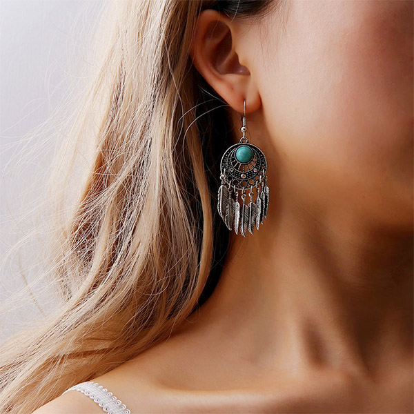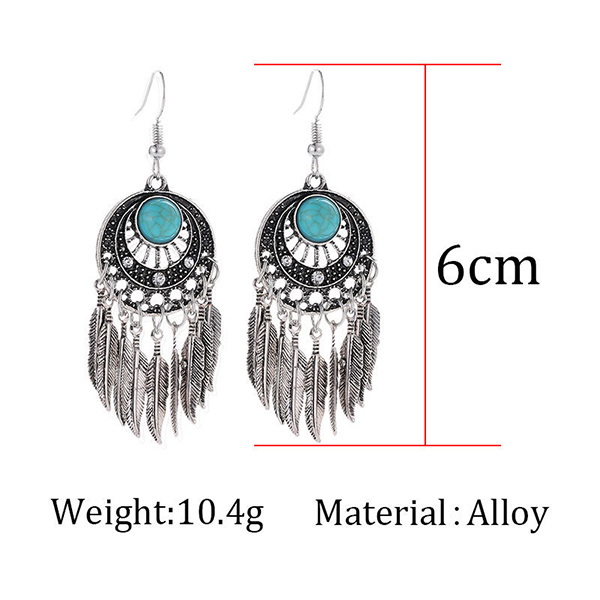 A pair of midweight drop earrings featuring a circle-shaped design,hanging etched feather fringe,enamel floral in middle of the circle and ornament rhinestone, with a fish-hook back.