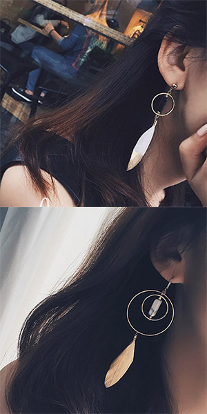 This pendant earring is outfitted with natural stone and donut feather shaped design,