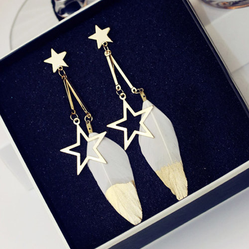 This pair of pendant earrings is crafted from the shape of pentagram and feather,