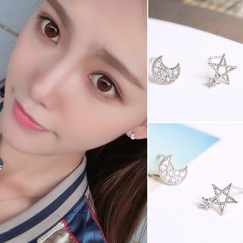 Fashion Rhinestone Inlaid Star & Moon Asymmetry Stud Earrings