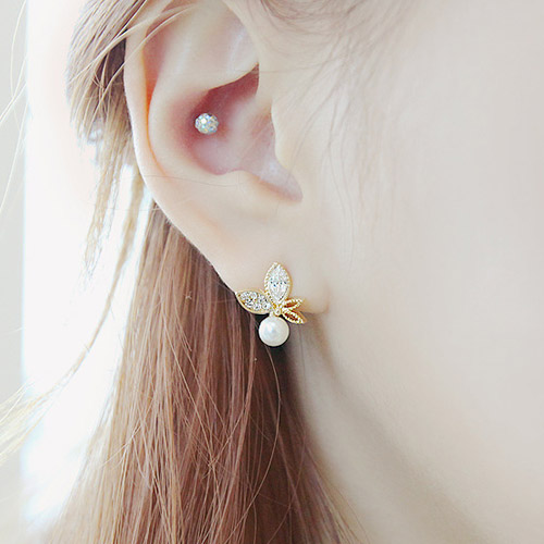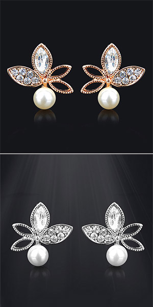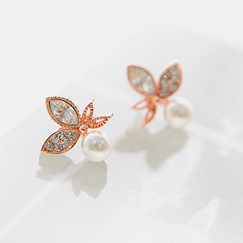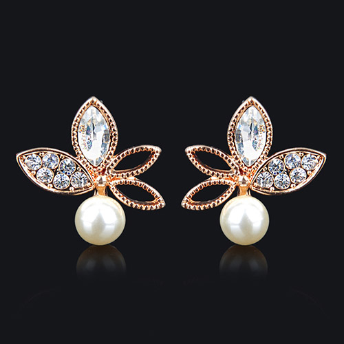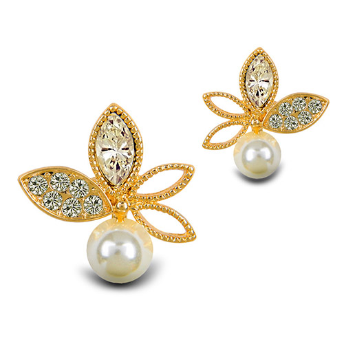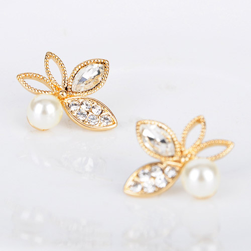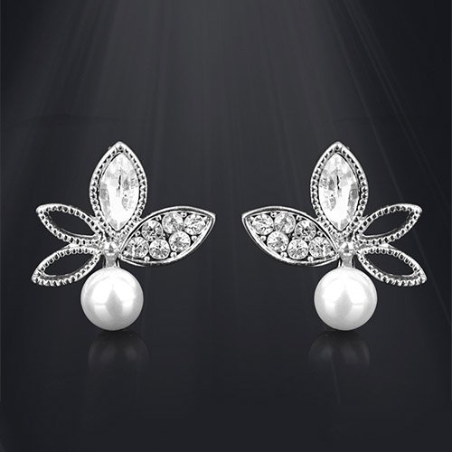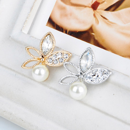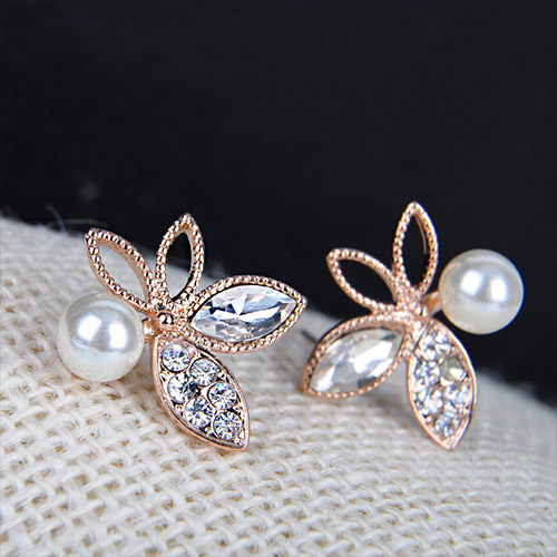 Fashion Rhinestone Leaf Flower Hollow Out Pearl Earring