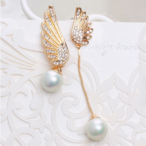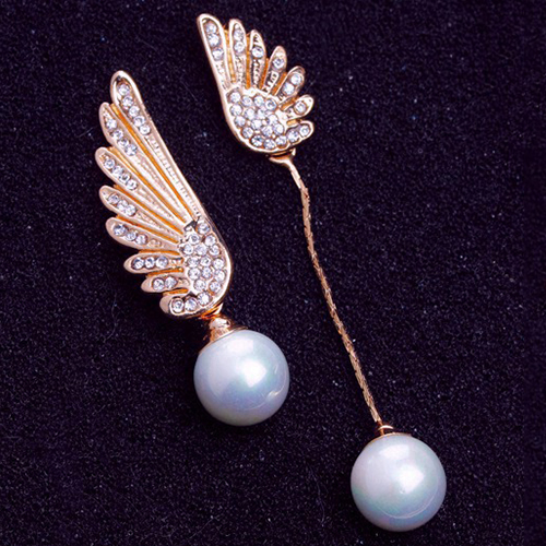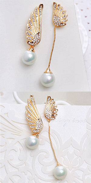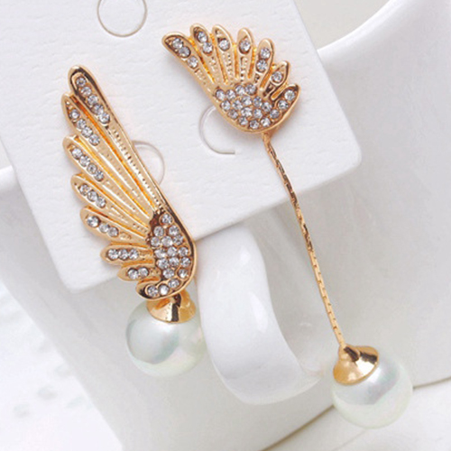 Romantic Asymmetrical Rhinestone Wings Pearl Stud Earrings