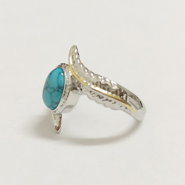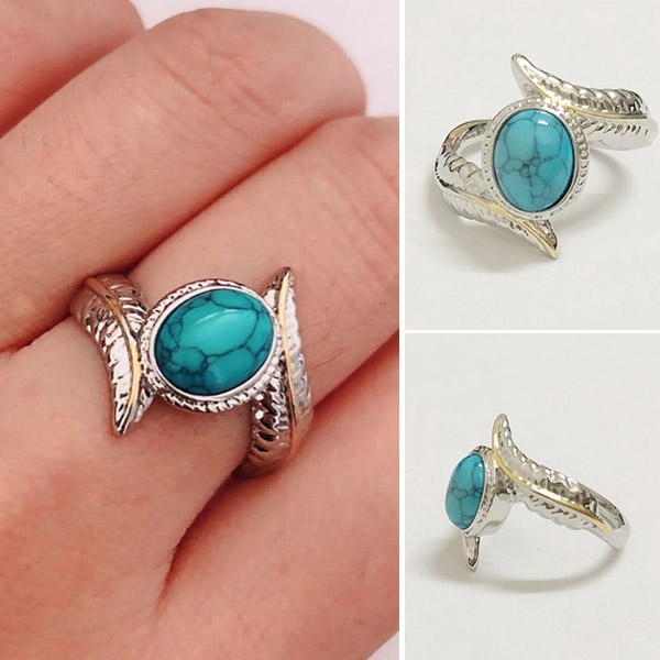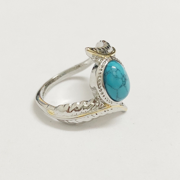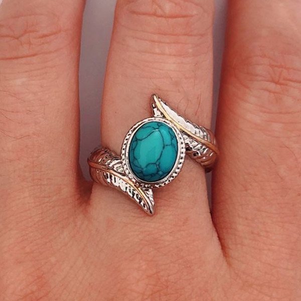 This ring is designed with feather shaped,inlaid with an imitation turquoise,chic yet stylish.