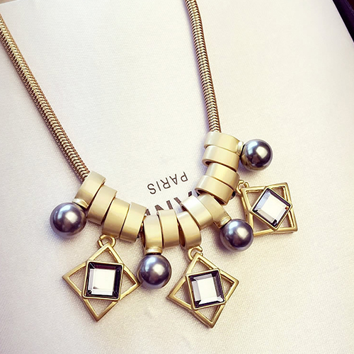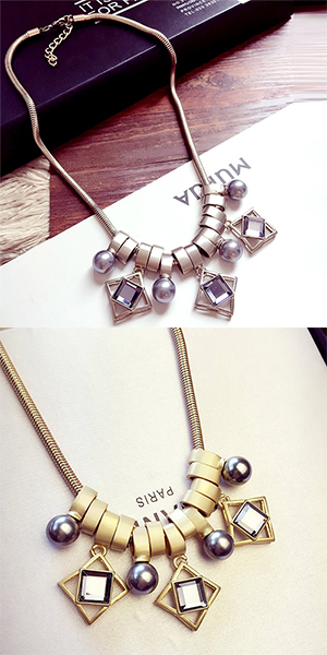 are anchored by a mix of faux gem, faux pearl and square cutout pendants, also features