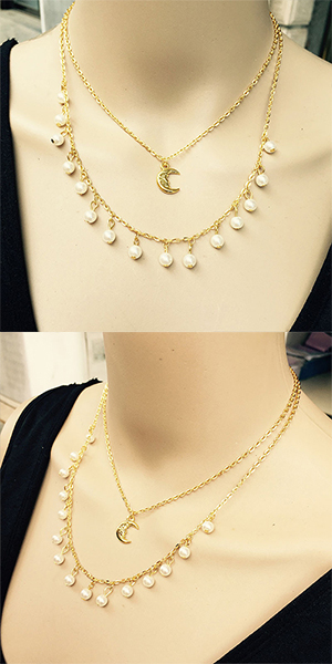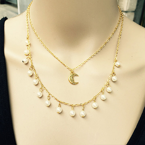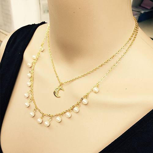 Fashion Layered Faux Pearl Moon Charm Necklace