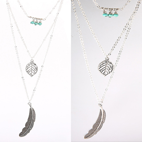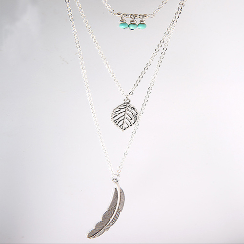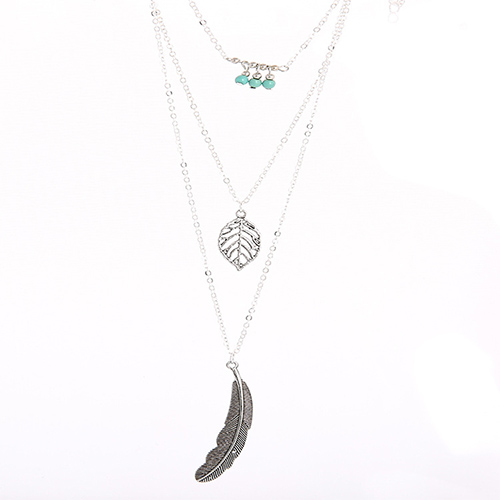 Fashion Leaf Feather Beaded Pendant Multilayer Necklace