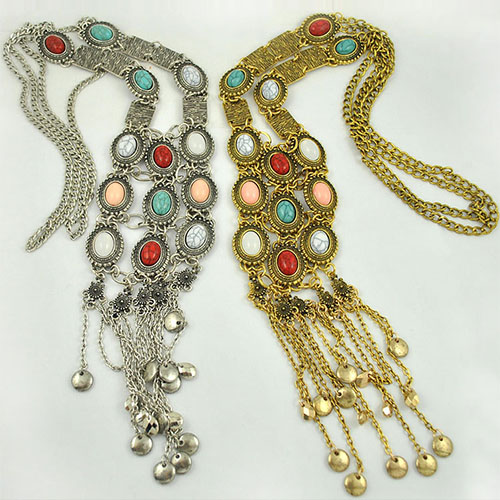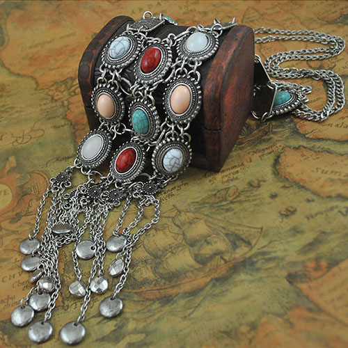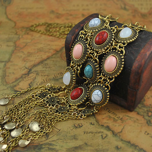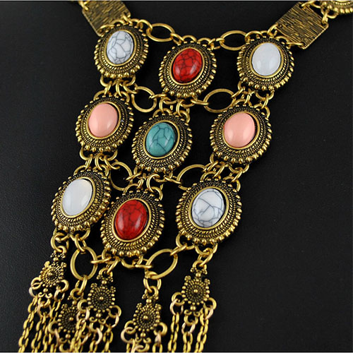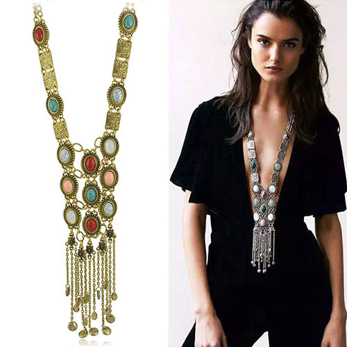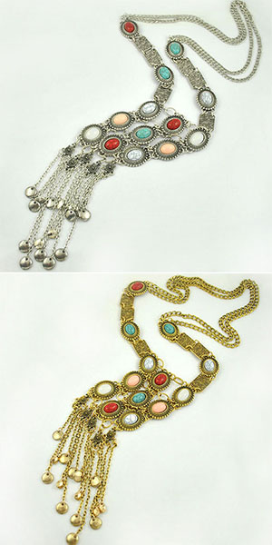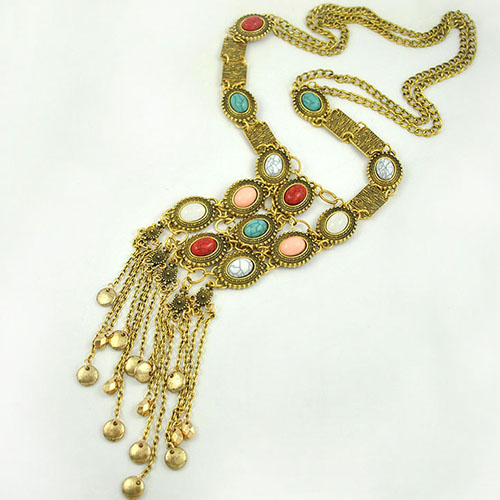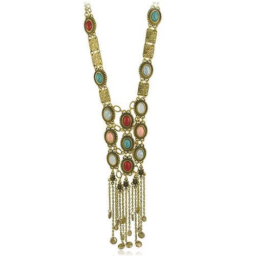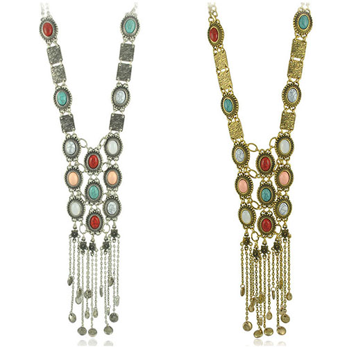 The necklace is styled with colorful gemstone patterns and tassel pendant, which will give you a charming