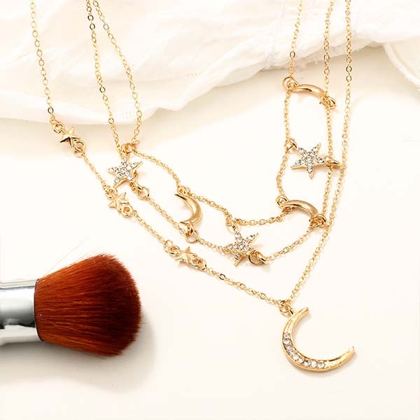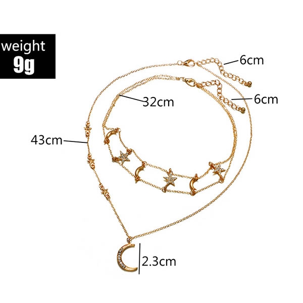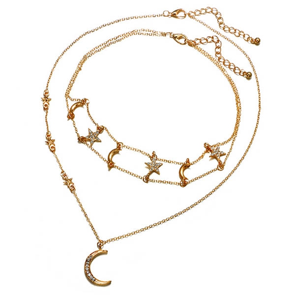 Fashion Rhinestone Inlaid Stars Crescent Pendant Multi-layer Necklace