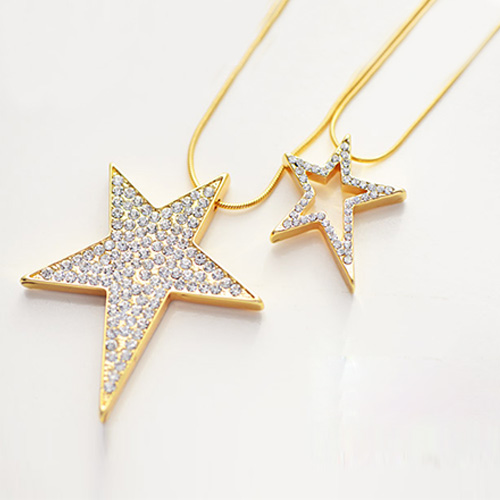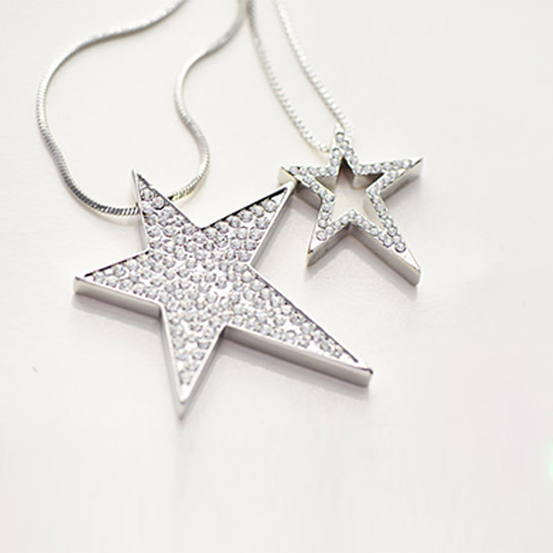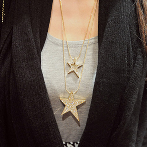 Make your wishes come true with this darling necklace! Sliver-tone or gold-tone necklace with star pendant which with rhinestone for decoration. Double layer chain design. It will absolutely add some fashion sense and bring luck for you.