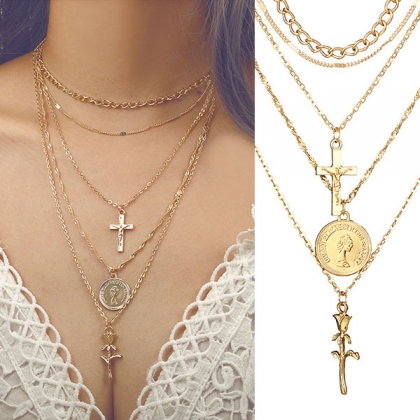 Punk Style Cross Rose Pendant Multi-layer Necklace