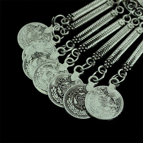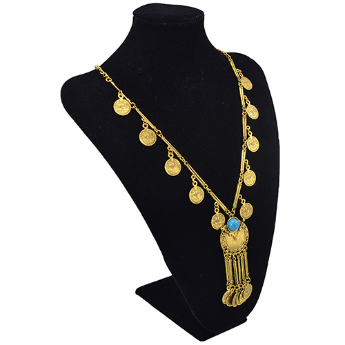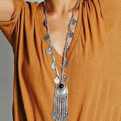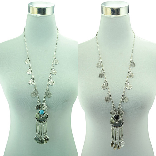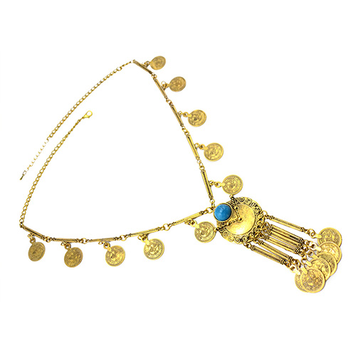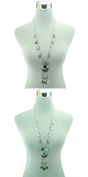 It features faux gem drop, etched coins accent fringe and along the long chain, also a lobster clasp.