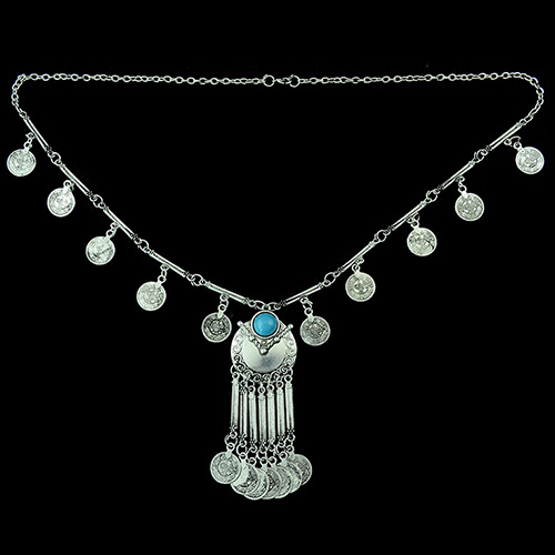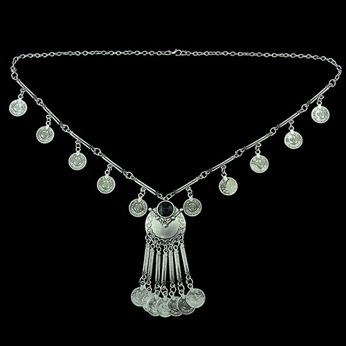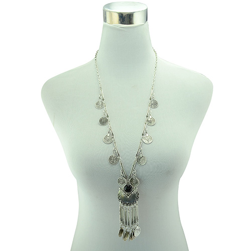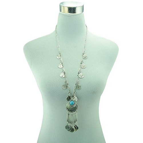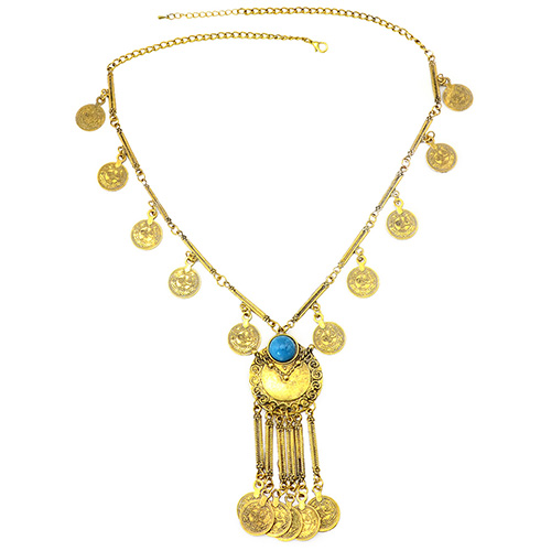 Retro Etched-Coin Fringe Faux Gem Necklace