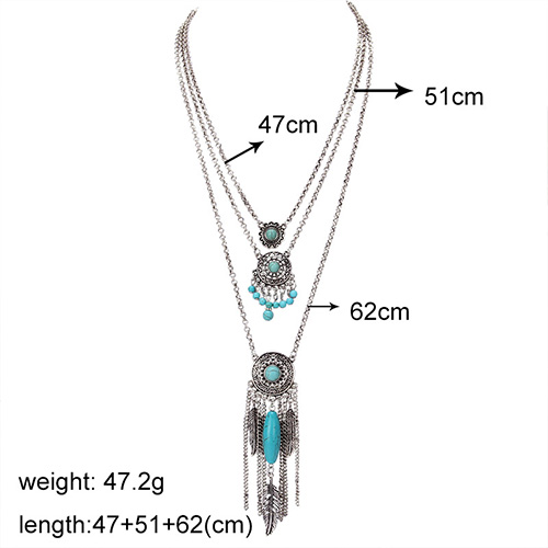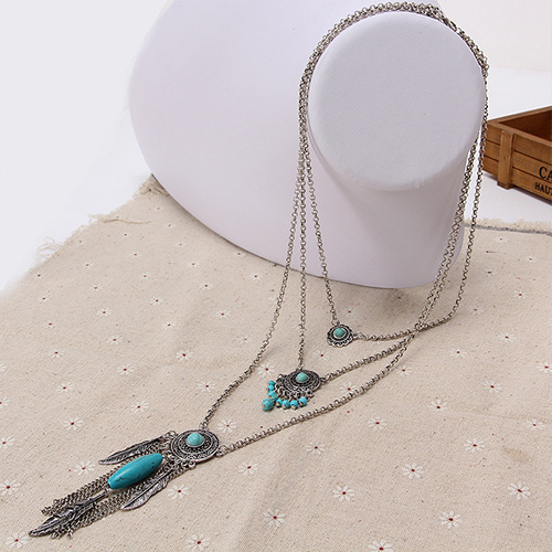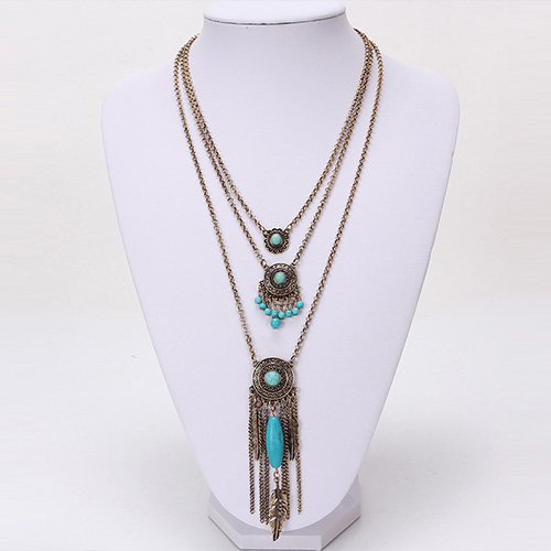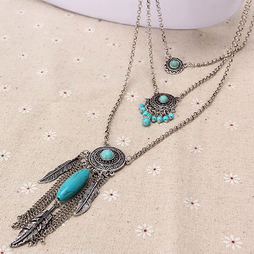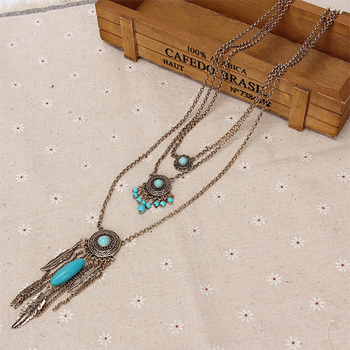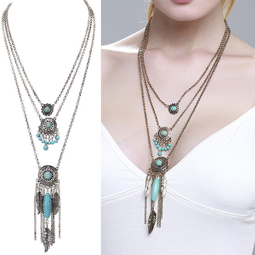 Retro Etched Feather Fringe Faux Stone Layered Necklace