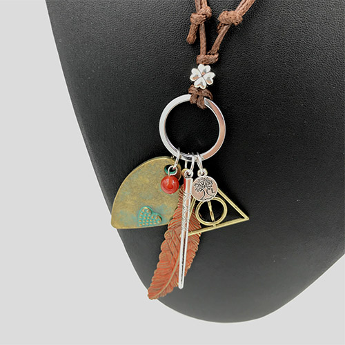 The necklace is outfitted with different geometric shaped patterns. The love shaped design