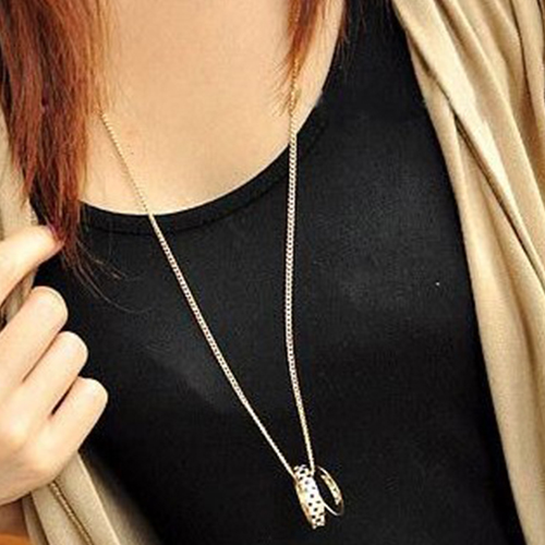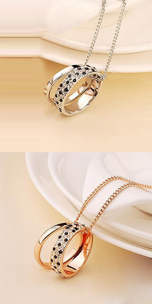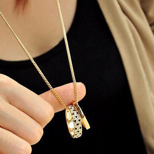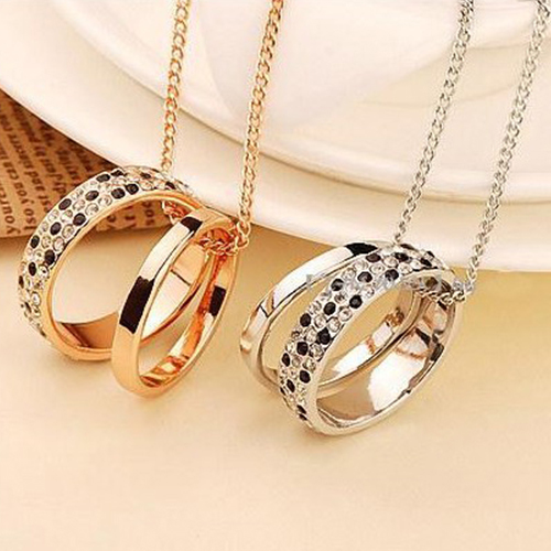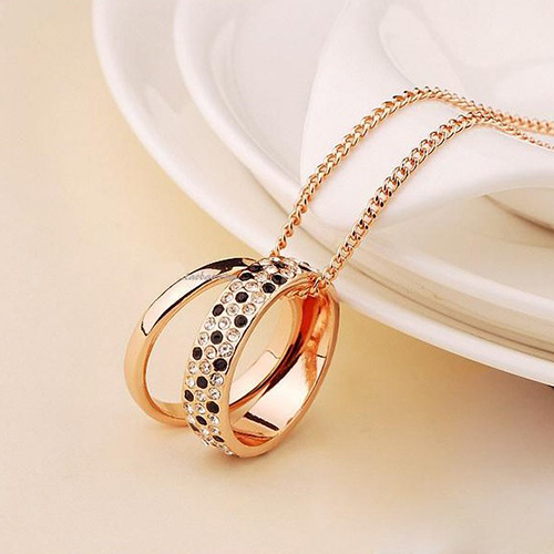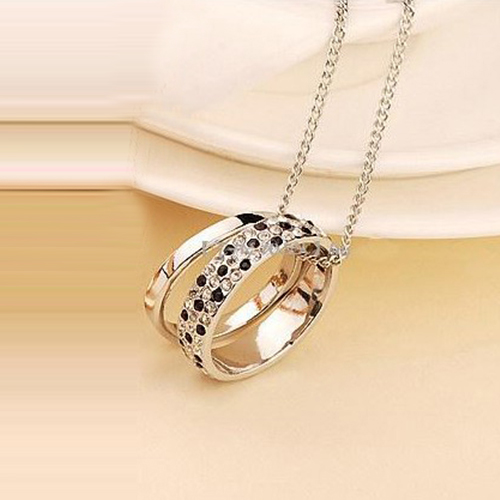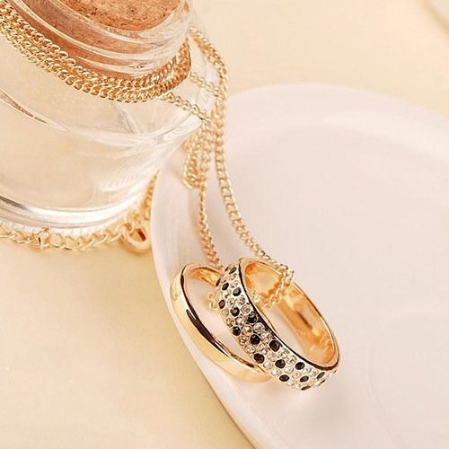Trendy Black-white Rhinestone Double Rings Pendant Sweater Necklace