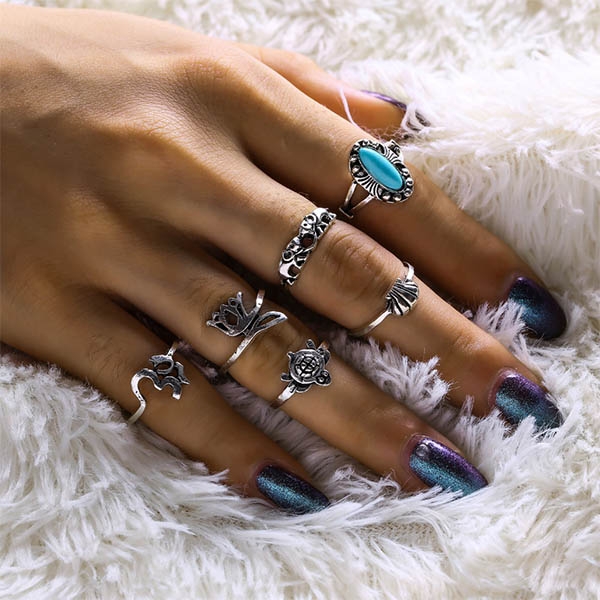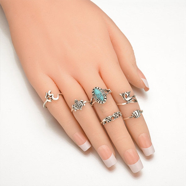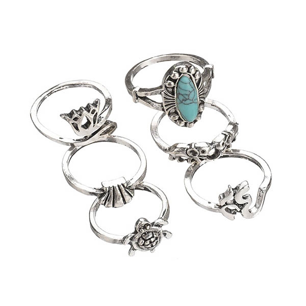 This ring set consists of 6 pieces different rings like crown shaped,turtle shaped and so on,