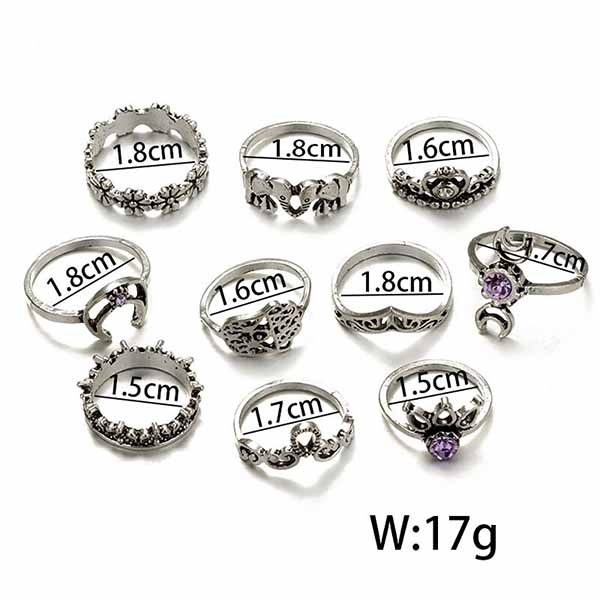 Retro Style Elephant Crown Curved Alloy Ring Set 10 pcs/Set