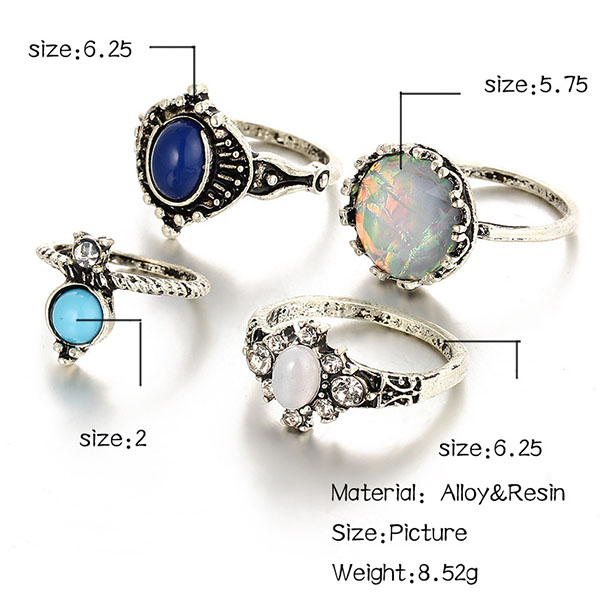 Consists of 4 piece different rings,inlaid with imitation gem and rhinestone,this ring set can lend you a retro,edgy and stylish style.