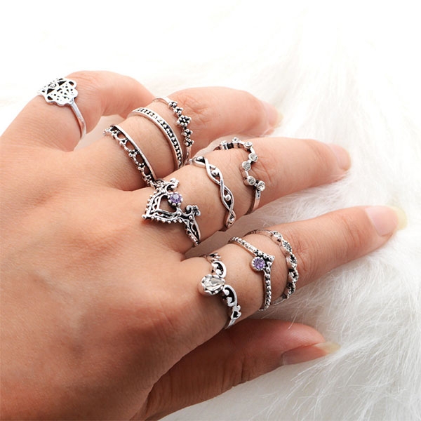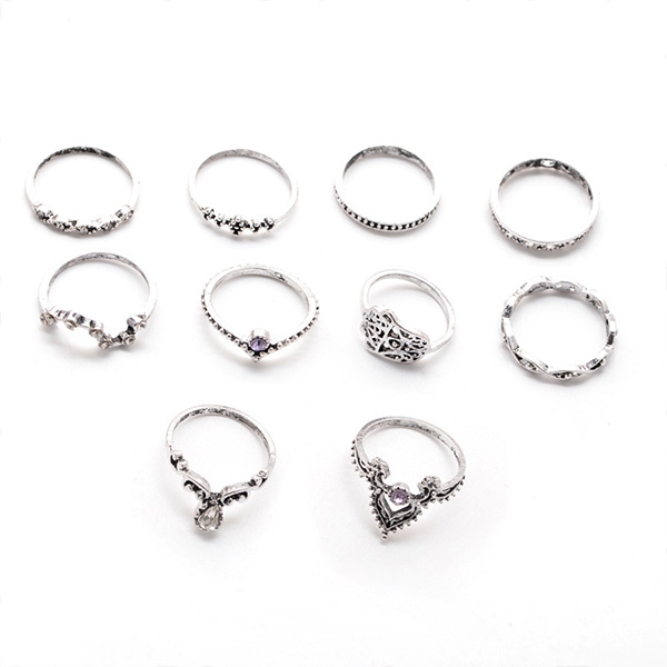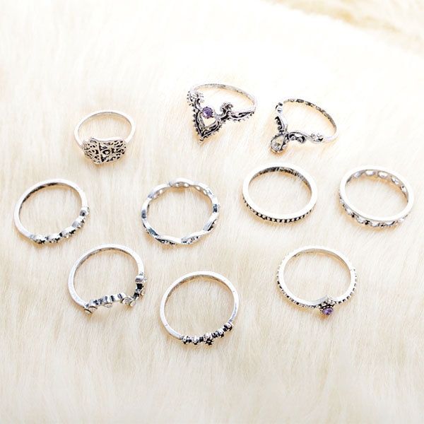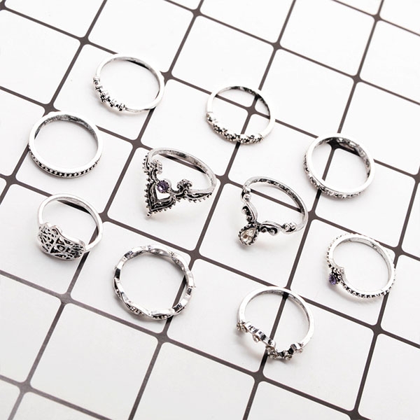 Boasts a retro yet classic silver tone,this alloy ring set consists of 10 pieces different rings,the hollow out