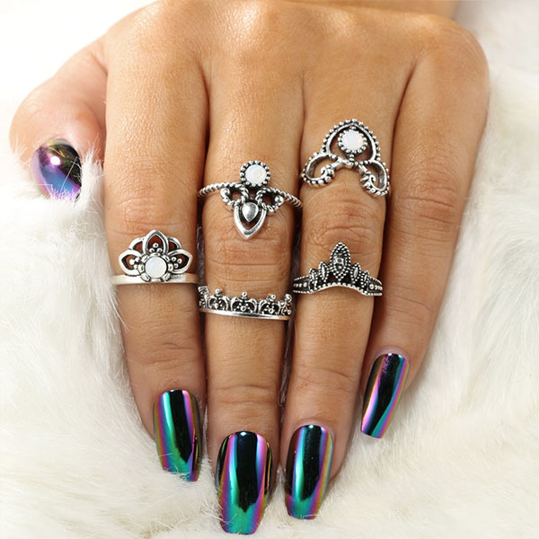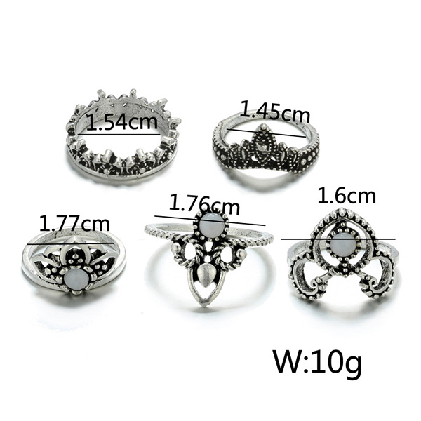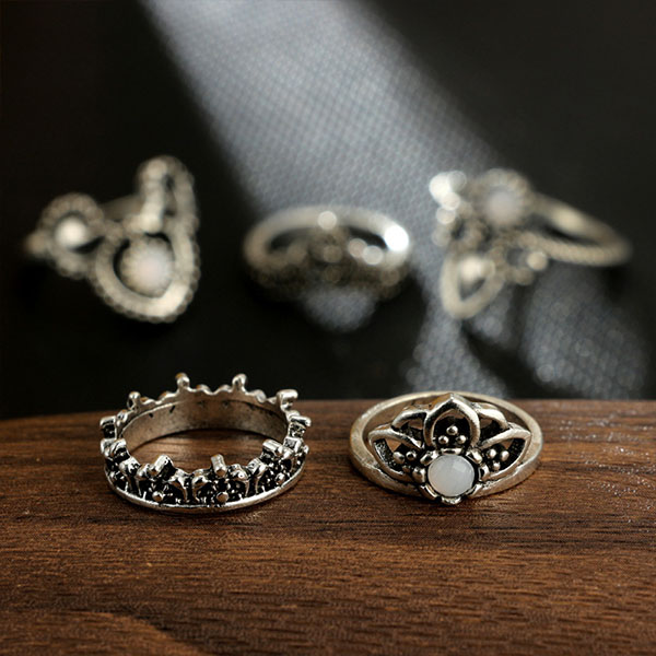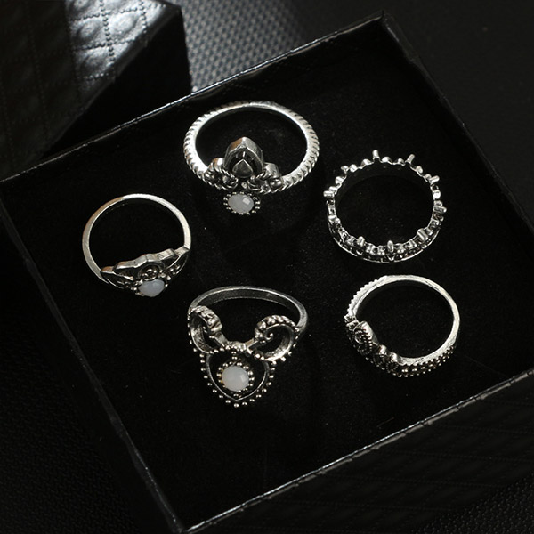You can add a dash of retro flavor to your overall look with this ring set. Including 5 pieces different shaped