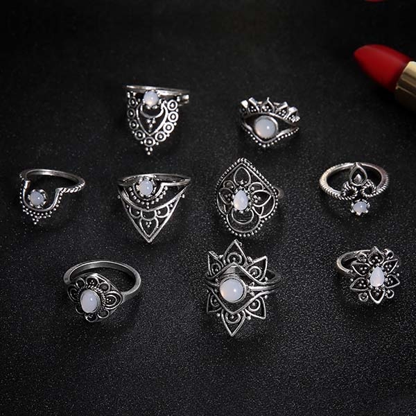 Retro Style Hollow Out Carving Faux Gem Inlaid Ring Set 9 pcs/Set