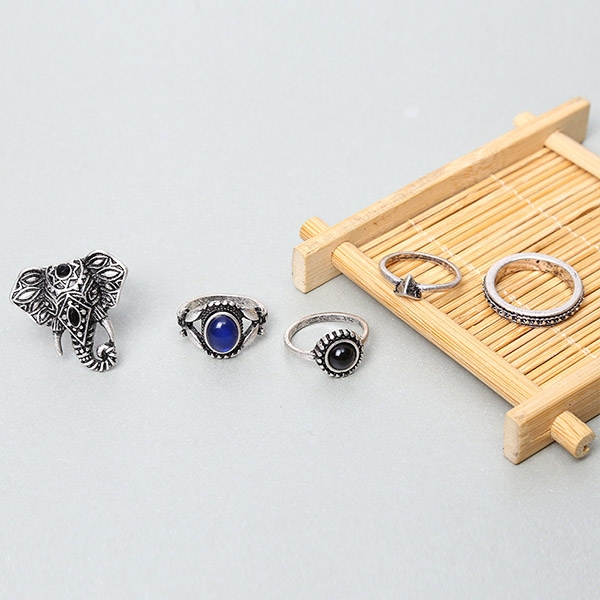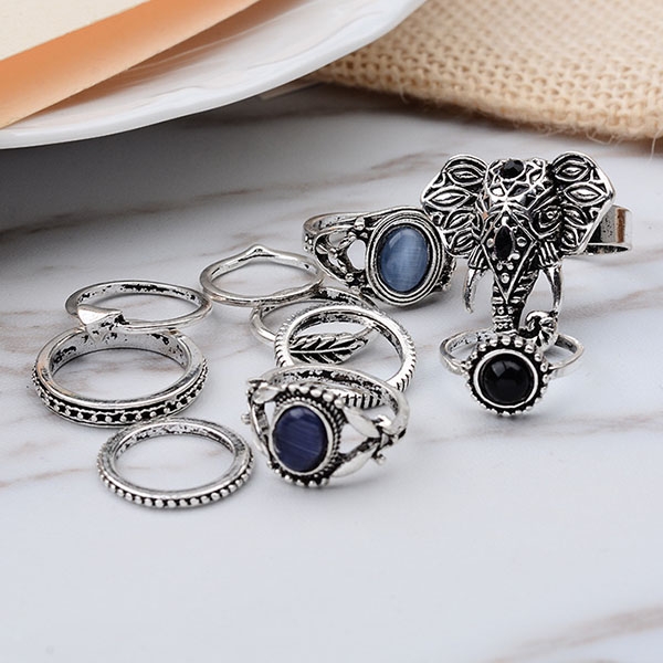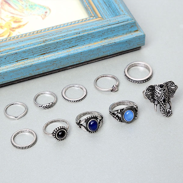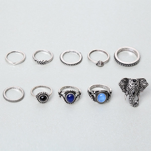 Retro Style Imitation Gem Inlaid Elephant Shaped Ring Set 10 pcs/Set