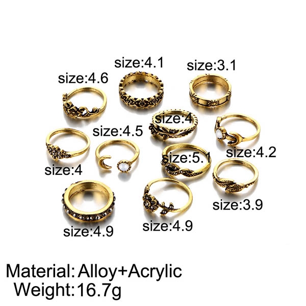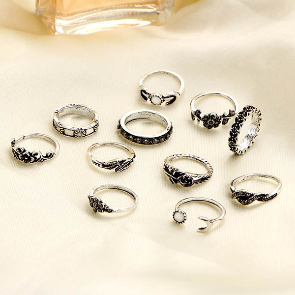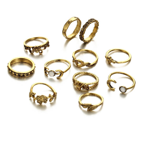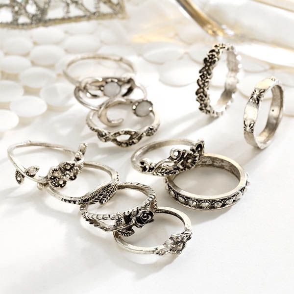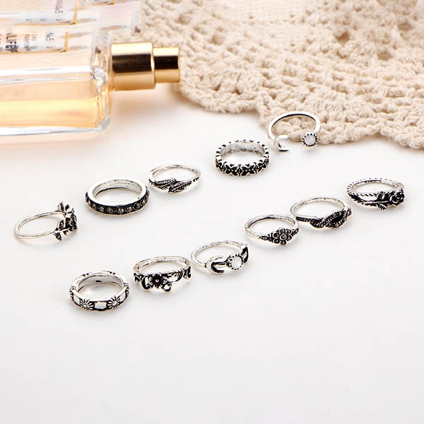 consist of 11 pieces different size ring with beautiful pattern curved, such as leaf, rose flower, crescent etc,