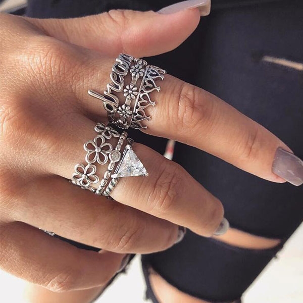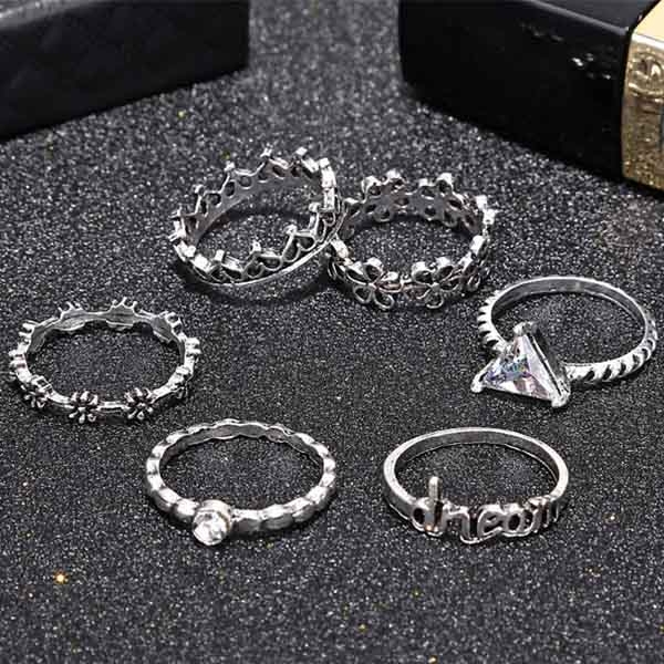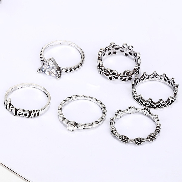 This ring set consists of 6 pieces different rings,coming with a retro yet stylish silver tone,which of course