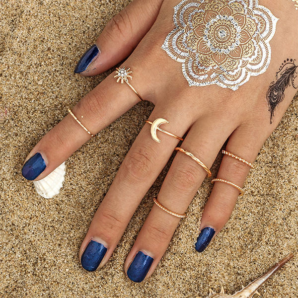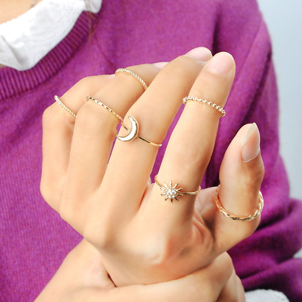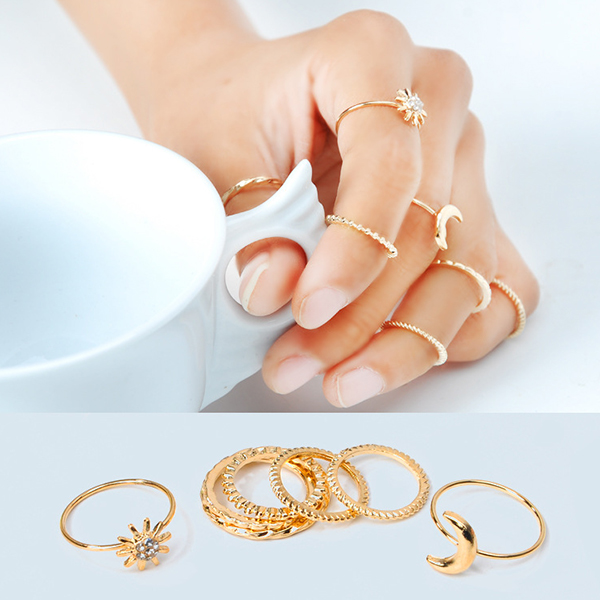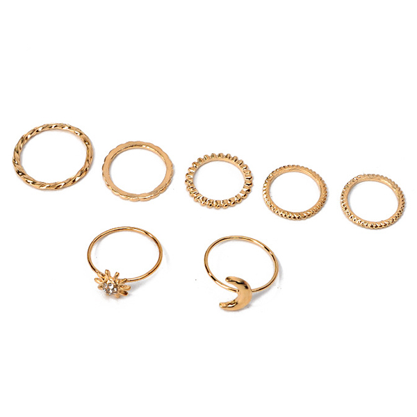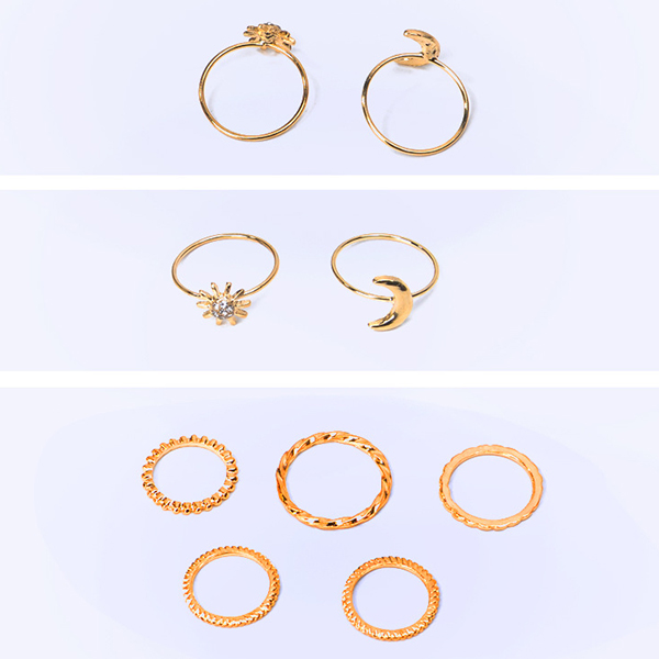 This ring set boasts a classic gold tone,including 7 pieces different rings,which can showcase your charming and