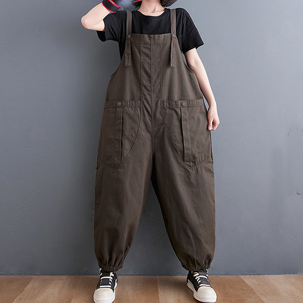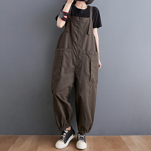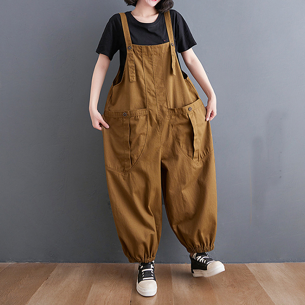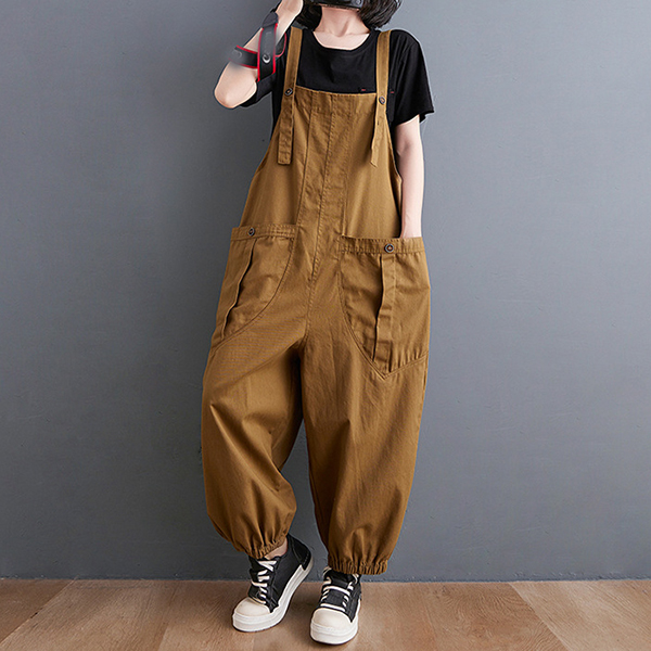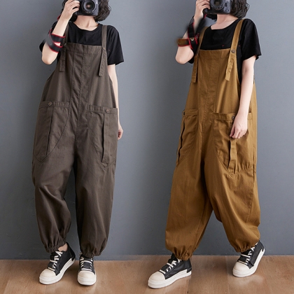 Fashion Adjustable Shoulder Strap Patch Pockets Loose Jumpsuit