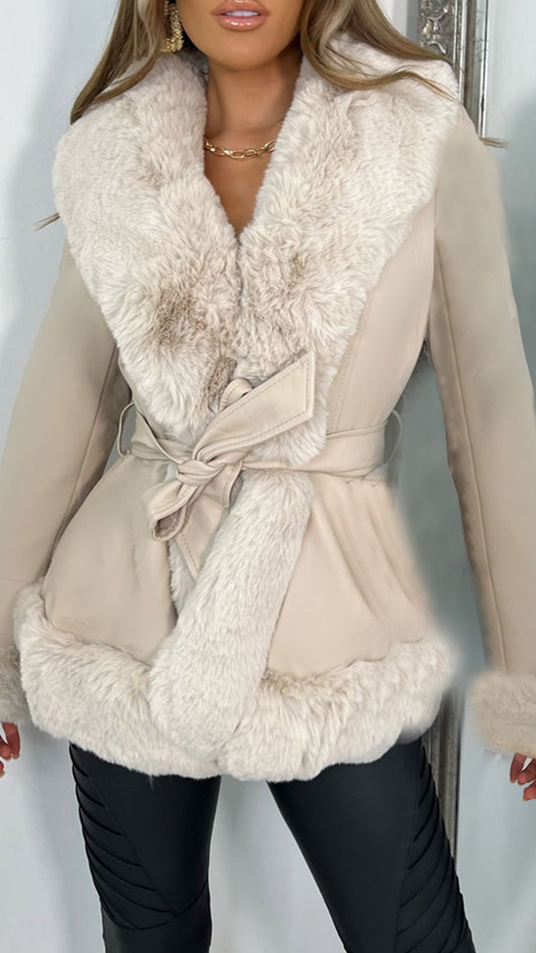 Crafted with high-quality materials, this coat offers both comfort and a fashionable look. The artificial fur spliced with artificial leather adds a luxurious and trendy touch, creating a visually captivating and unique design. Hope you like it.
