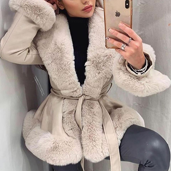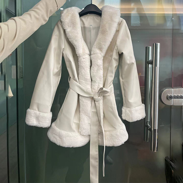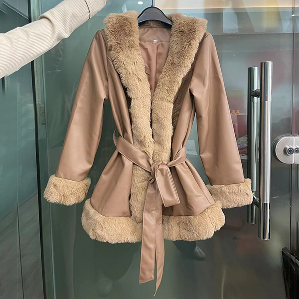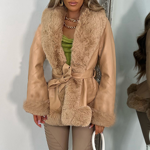 Fashion Artificial Fur Spliced Artificial Leather PU Long Sleeve Self-tie Warm Coat for Women