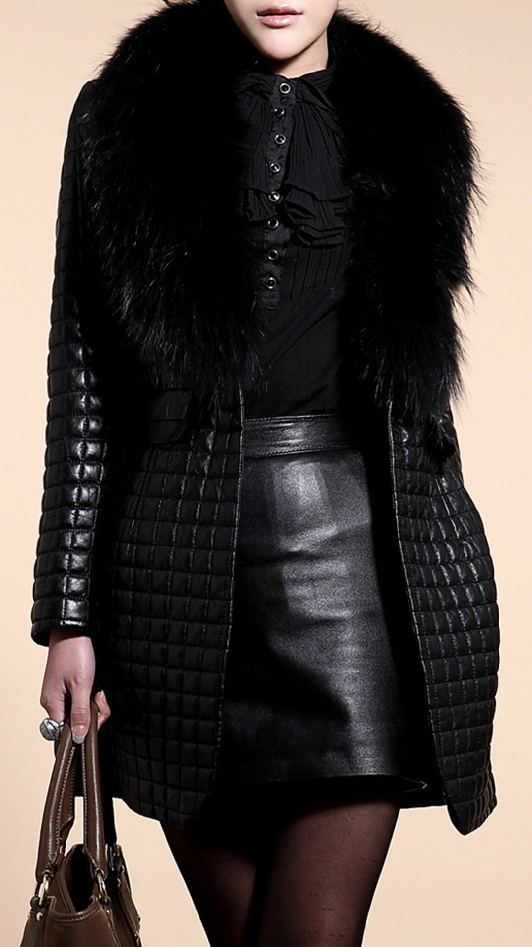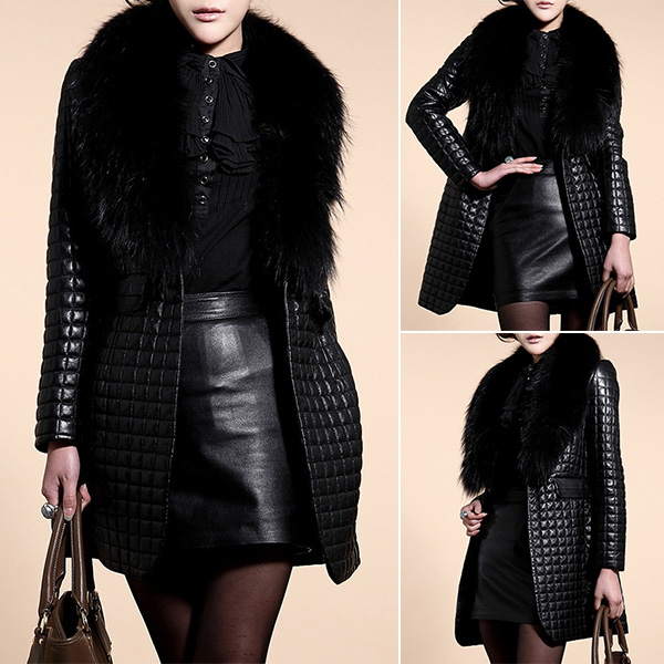 Fashion Artificial Fur Spliced Collar Long Sleeve Diamond Pattern Artificial Leather PU Jacket