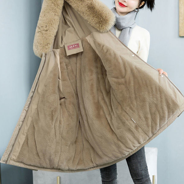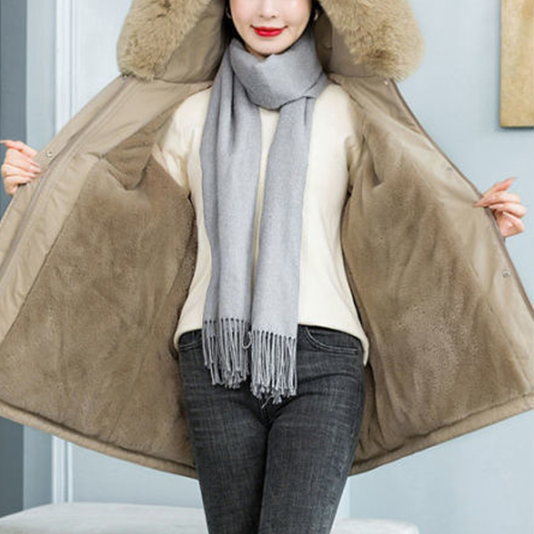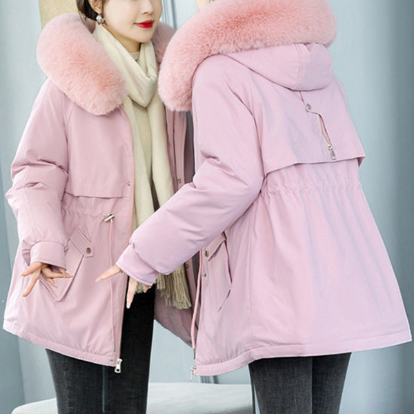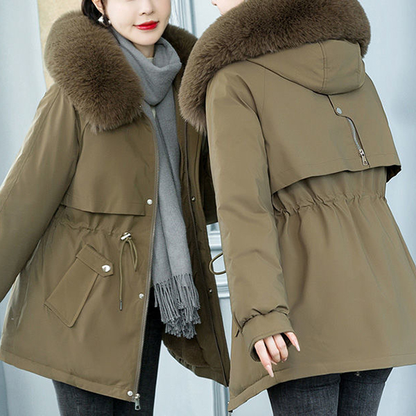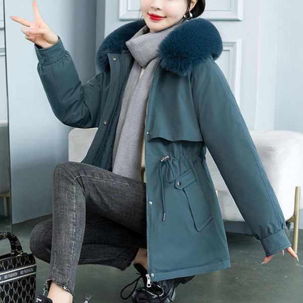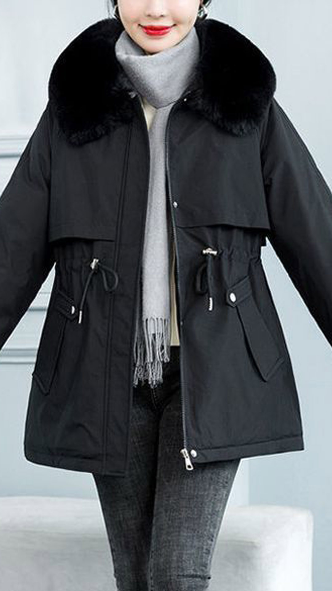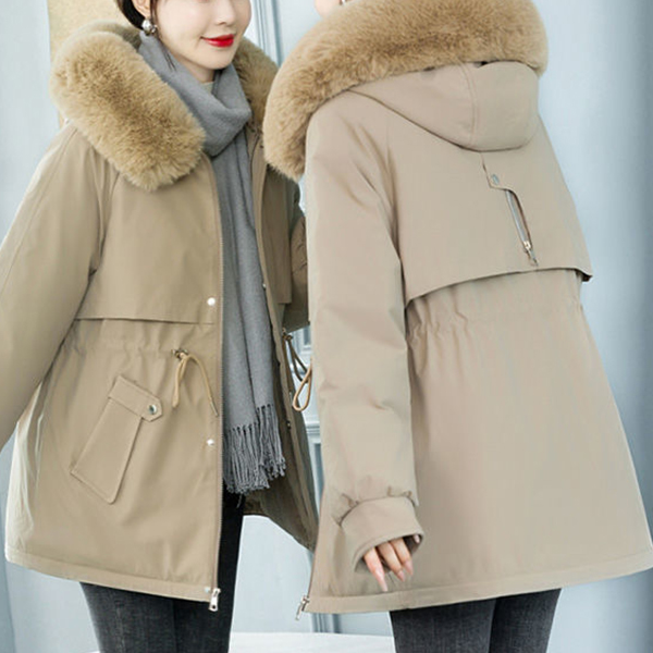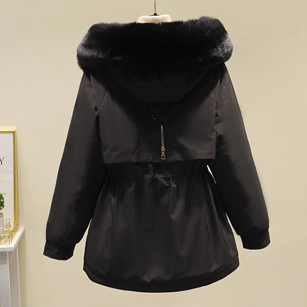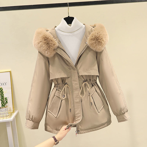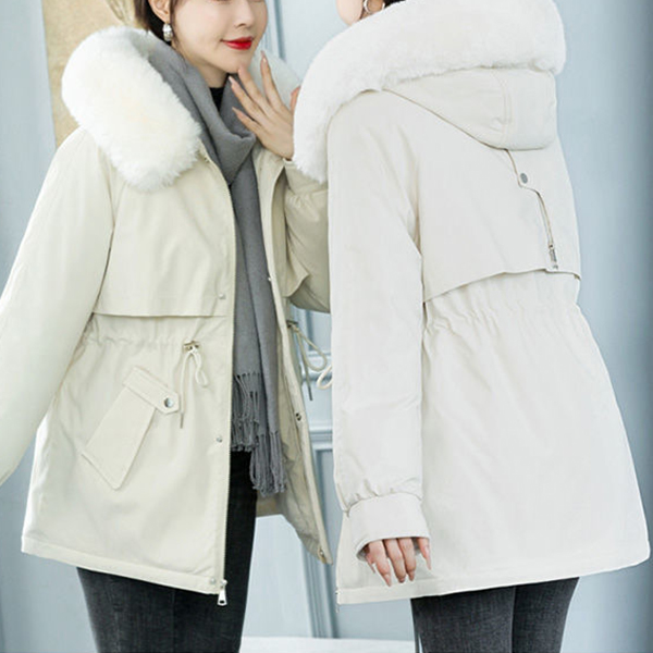 Fashion Artificial Fur Spliced Hooded Drawstring Waist Plush Lined Parka Jacket for Women